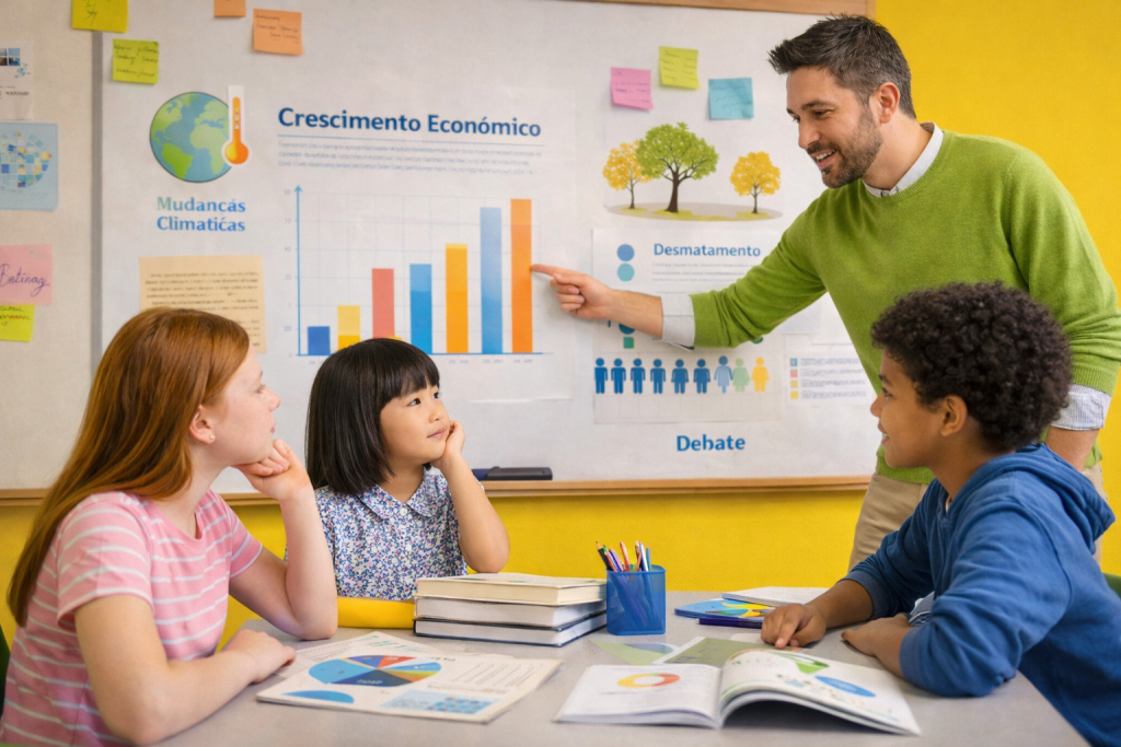 Um professor de Filosofia, por exemplo, pode partir de uma reportagem sobre conflitos internacionais ou decisões políticas para discutir ética, argumentação e pontos de vista. Já na Matemática, uma notícia aparentemente distante do conteúdo curricular pode se transformar em ponto de partida para reflexões complexas. Camila cita o caso de uma matéria sobre a chamada “bolha financeira do Morango do Amor”, usada por professores para trabalhar noções de Educação Financeira, leitura de gráficos e análise de dados econômicos com os estudantes.